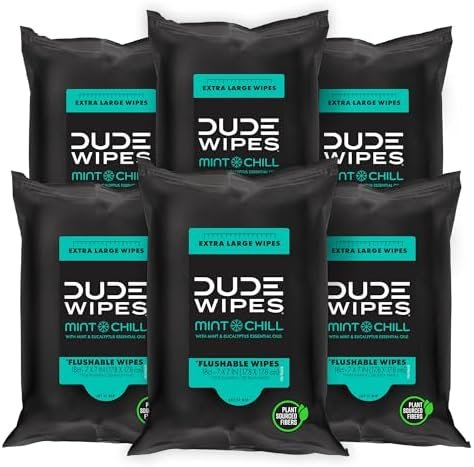 DUDE Wipes – Flushable Wipes Travel Pack – 6 Pack, 108 Wipes – Mint Chill Extra-Large Adult Wet Wipes – Vitamin-E, Aloe Vera, Eucalyptus, and Tea Tree Oils – Septic and Sewer Safe Butt Wipes